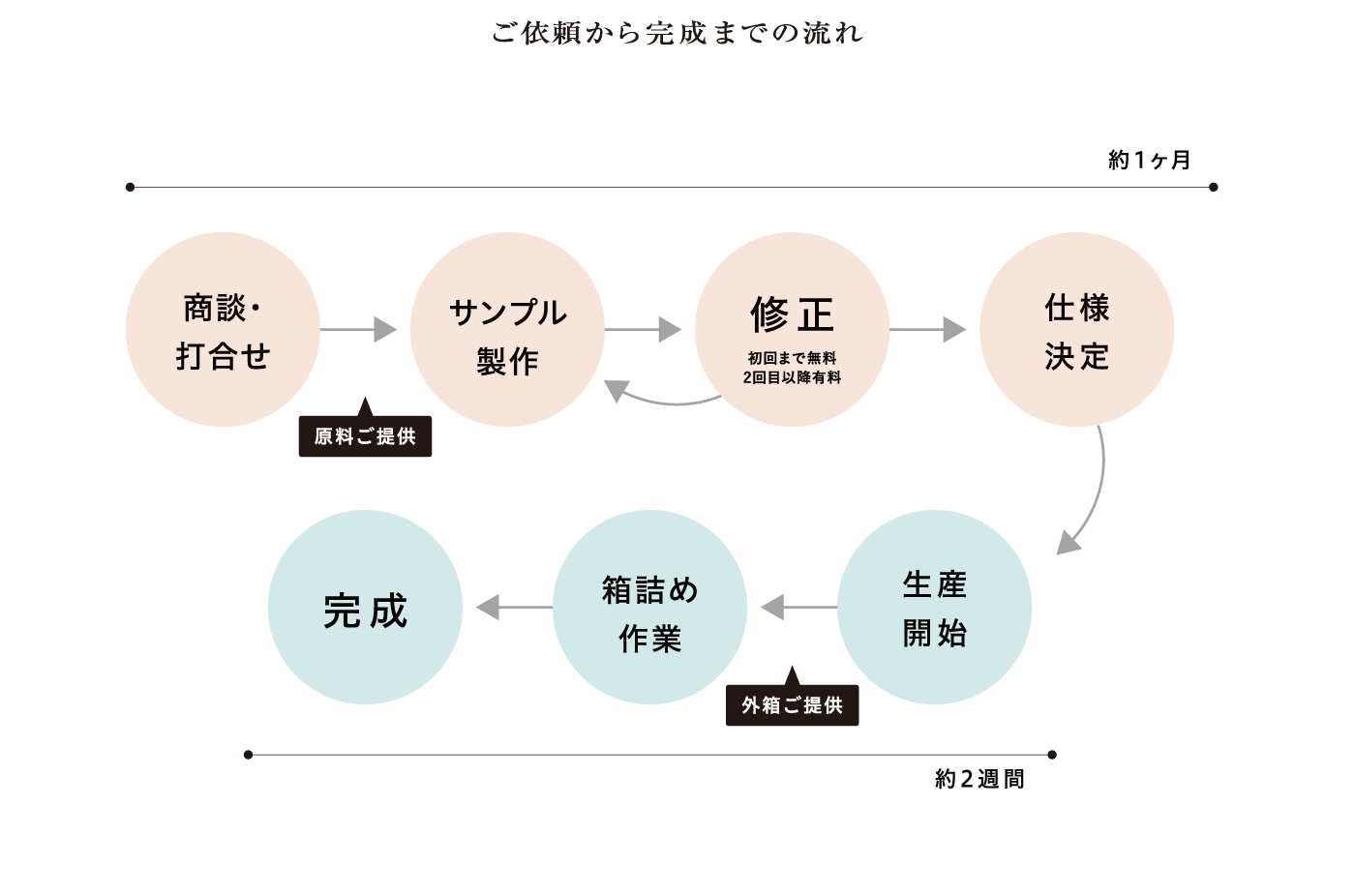 ロイスでは、OEM製造を承っております。(最小ロット1000個〜) お客様との打合せ(材料・数量・単価・納期等)で方向性を共有し、サンプル製作へ進みます。製品と同じ仕様にてサンプルを製作し、仕様が確定しましたら、およそ2週間(1000個の場合)で納品をさせていただいております。どうぞお気軽にご相談ください。